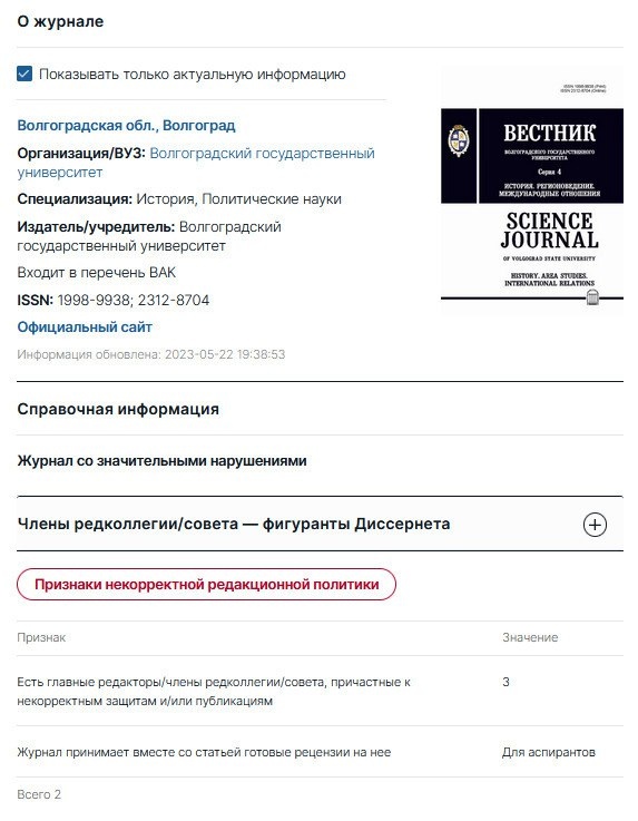 Серия 4. История. Регионоведение. Международные отношения Организация/ВУЗ: ВолГУ Специализация: История, Политические науки Входит в перечень ВАК https://www.dissernet.org/magazine/vestnik_volgogradskogo_gosudarstvennogo_universiteta_seriya_4_istoriya_regionovedeniye_mezhdunarodnyye_otnosheniya