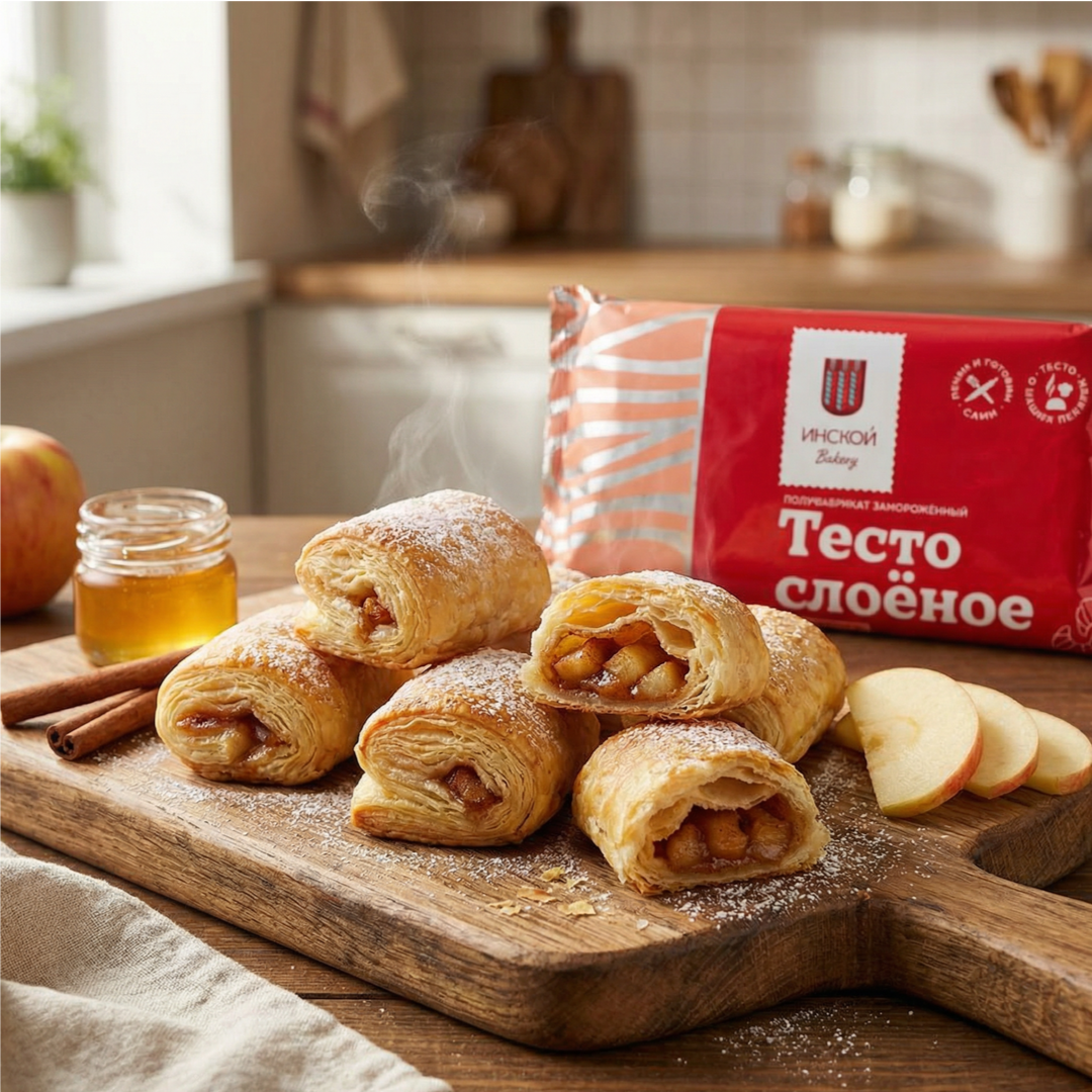Обжарьте их на сковороде с небольшим кусочком сливочного масла 3–4 минуты. 2. Добавьте сахар и корицу, перемешайте — начинка станет ароматной и карамельной. 3. Слоёное тесто раскатайте и нарежьте на полоски. 4. Выложите яблочную начинку, сверните полоски в небольшие рулетики. 5. Смажьте рулетики яйцом. 6. Выпекайте 15–20 минут при 180°C до румяной корочки. ✨ В результате получается десерт с хрустящим слоёным тестом, мягкой яблочной начинкой и ароматом корицы — как маленький домашний штрудель. Команда хлебокомбината Инской