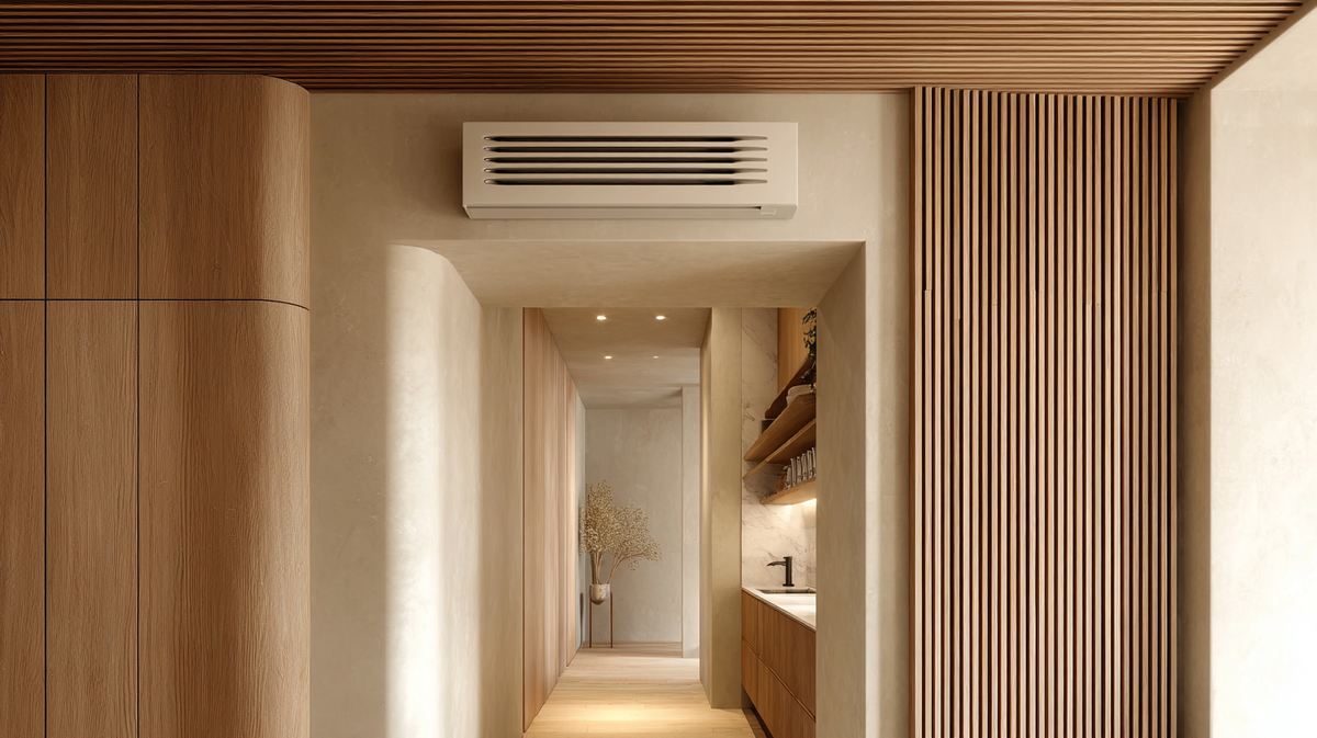 - Сделать частью геометрии интерьера. Если в комнате есть подвесной потолок, стеновые панели или линии встроенной мебели, кондиционер можно вписать в этот ритм, чтобы он читался как продолжение конструкции, а не инородное тело.