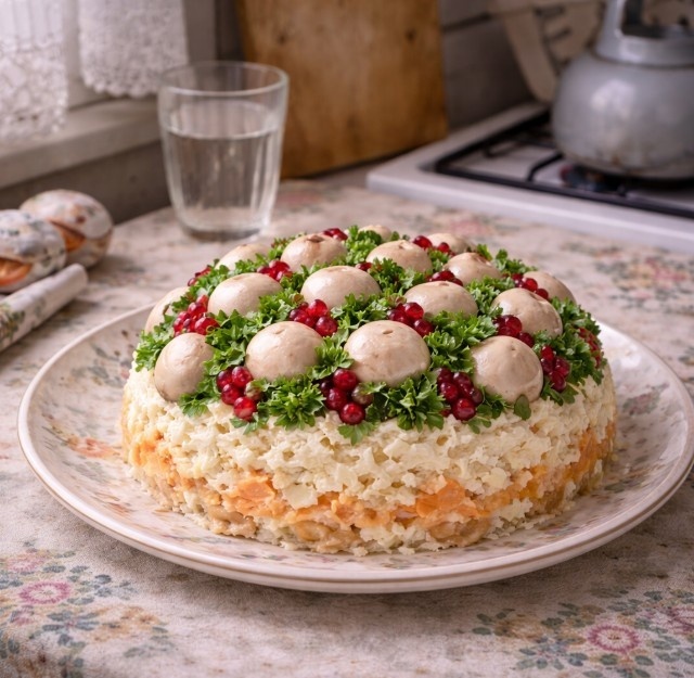 Знаете, этот салат я впервые собрала на Новый год в девяносто восьмом. Хотелось чего-то праздничного — назвала «Грибная поляна», и прижилось. Четыре картофелины и две морковки хорошенько мою, отвариваю в кожуре до готовности, остужаю, чищу и тру на крупной тёрке. Отдельно натираю граммов пятьдесят твёрдого сыра. Теперь — сборка. На блюдо ставлю сервировочное кольцо. Первым слоем — двести граммов целых шампиньонов, шляпками вниз. Сверху — нарезанный зелёный лучок, два пёрышка. Затем картофель, щедро промазываю майонезом. Дальше тёртый сыр, двести граммов печени трески, столовую ложку каперсов, тёртую морковь, снова майонез, и завершаю картофелем. Ложкой слегка прижимаю и убираю в холодильник ровно на час. Мой Володя вечно заглядывал: «Ну что, можно?» — а я гнала: пусть пропитается. Перед подачей накрываю форму тарелкой, переворачиваю, осторожно снимаю кольцо — грибочки оказываются сверху! Украшаю веточками петрушки и зёрнами граната — как рубины на лесном мху. Помню, мама говорила: «Гал