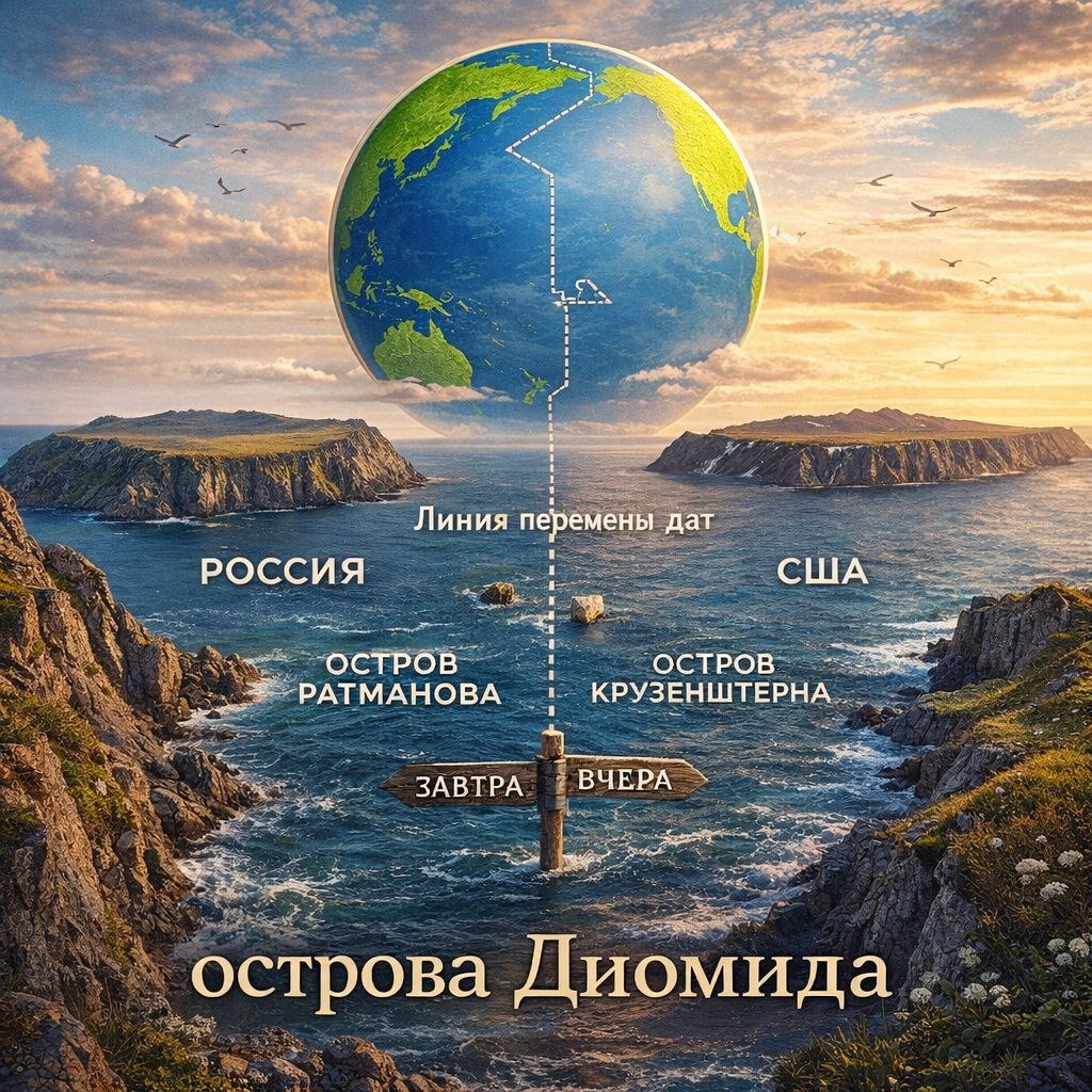 Удивительнейшая на свете пара островов в Беринговом проливе: Большой Диомид (остров Ратманова) и Малый Диомид (остров Крузенштерна). С первого взгляда это ничем не примечательные скалистые северные острова – более крупный остров Ратманова в длину размером около семи километров, а остров Крузенштерна – вообще три с хвостиком. Однако не торопитесь! Остров Ратманова принадлежит России, и является её самой восточной точкой. Остров Крузенштерна принадлежит США, и является одной из самых западных точек этой страны. На данный момент на американском острове проживает около 135 человек(эскимосы), работает школа и магазин, а на российской территории действует закрытая пограничная застава, основанная в 1941 году. Часовой пояс на острове Ратманова – UTC+12, а на острове Крузенштерна – UTC–9. Это означает, что между двумя островками, которые разделяет только неширокий пролив – около 3800м – разница во времени 21 час зимой и 20 часов летом. Неудивительно, что местные жители часто называют эти ос