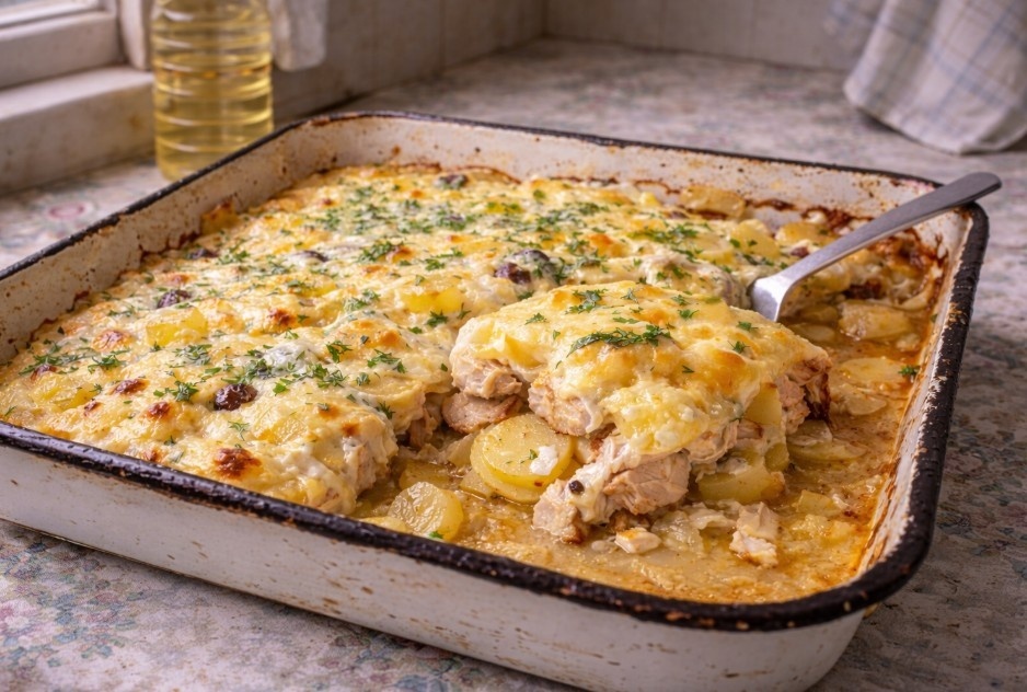 Этот рецепт я называю своим секретным оружием. Шучу, конечно, но доля правды есть — Володя, когда мы ещё только встречались, попробовал и сказал: «Галя, я пропал». Женаты уже тридцать лет. Весь фокус — в маринаде. Три-четыре луковицы режу полукольцами и в майонез. Двадцать картофелин нарезаю кружочками, солю и тоже в майонез. И курицу — сколько уйдёт — туда же, в майонез, с солью и специями по вкусу. Двух упаковок майонеза как раз хватает на всё. И час пусть стоит, пропитывается. Помню, мама говорила: «Терпение на кухне — половина вкуса». Через час выкладываю на противень слоями: картошка, лук, мясо. Если вместо курицы берёте свинину — порядок чуть другой: картошка, мясо, лук. В духовку на двести двадцать градусов, сорок-пятьдесят минут. Достаю, посыпаю тремястами-четырьмястами граммами тёртого сыра и рубленой зеленью. Обратно в духовку — буквально на пару минут, пока сыр не расплавится золотистой шапкой. А запах по всей квартире такой, что соседка Нина однажды постучала: «Галина, что