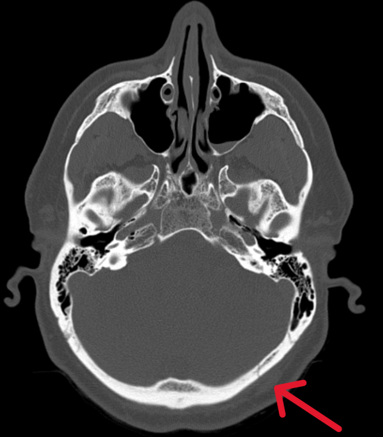 Сегодня представим вам клинический случай, в основе которого лежит классический механизм ударно-противоударной травмы головы. Пациент 40 лет, страдающий гипертонической болезнью, обратился в Отделение экстренной помощи через несколько дней после падения. За 2 недели до падения пациенту была проведена коррекция антигипертензивной терапии с увеличением дозы одного из препаратов. В день падения при резком вставании с кровати пациент почувствовал головокружение, упал и потерял сознание. Головокружение и потеря сознания могли быть проявлением так называемой «ортостатической гипотензии», когда организм не успевает отреагировать на повышенную потребность в кровотоке при резкой вертикализации, которая может быть побочным эффектом антигипертензивных препаратов, а также следствием обезвоживания или хронических заболеваний. Пациент обратился в Ильинскую больницу, где была проведена компьютерная томография головного мозга и выявлены следующие изменения: Перелом костей черепа и ушиб головного мозга