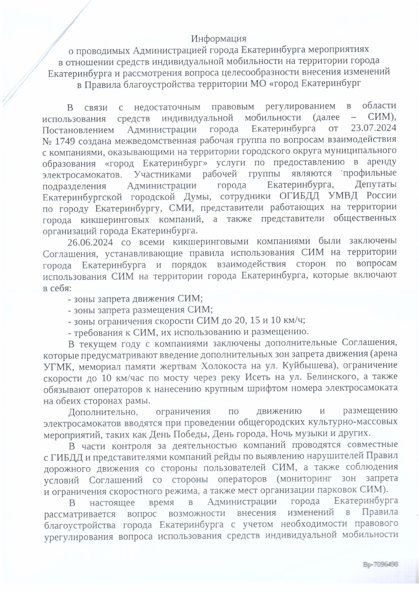 Сезон приближается семимильными шагами. «Скоро эти “табуретки” оттают», – один за другим высказываются горожане. «Опять на дорогах начнется хаос», – подхватывают другие. За горькой иронией скрывается накопившаяся усталость. Екатеринбург – наш общий дом, где каждый имеет право на комфорт и безопасность. Но пока что пользователи средств индивидуальной мобильности (СИМ) представляют угрозу для окружающих: лихачат, нарушают элементарные правила дорожного движения, бросают своих «железных коней» где попало. Пешеходы идут и оглядываются… И в других городах-миллионниках картина не лучше. В связи с чем Президент поручил Министерству транспорта и МВД проработать варианты, как дополнительно отрегулировать использование СИМ. Должностные лица также обсудят, возможно ли установить ограничения на передвижение электросамокатов, электровелосипедов по тротуарам. Свои инициативы ответственные доложат к 1 июля. Параллельно с федеральной инициативой действуют власти столицы Урала. В череде депутатских за