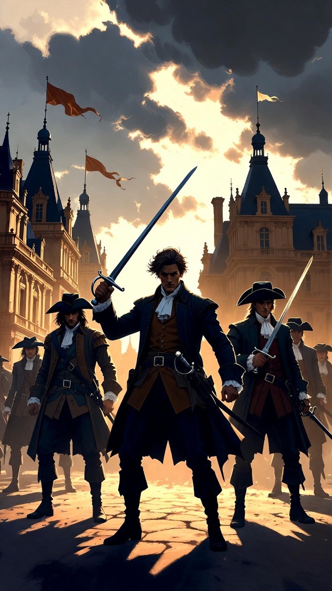Д’Артаньян, молодой гасконец, прибывает в Париж с мечтой стать мушкетёром. Он сразу попадает в дуэль с придворными и знакомится с тремя мушкетёрами: Атосом — мудрым и скрытным, Портосом — сильным и веселым, Арамисом — религиозным и хитроумным. Их дружба укрепляется через совместные приключения и сражения.