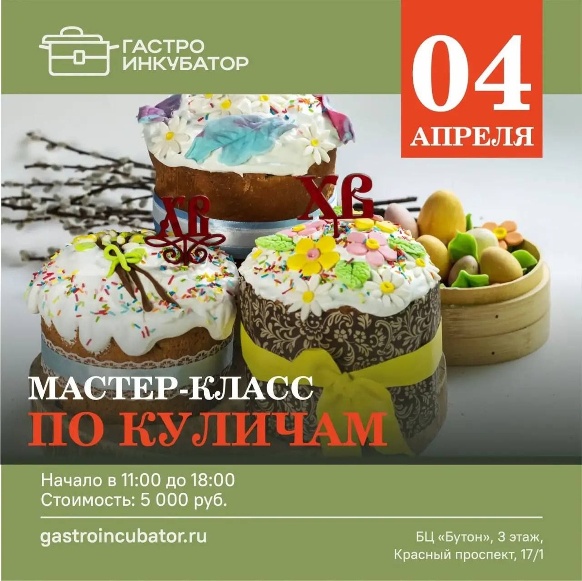 ! Уже 4 апреля ждем всех, кто хочет научиться печь идеальные куличи без хлопот🧁 Вместе с технологом Светланой Громогласовой вы: ✔ Испечете два вида куличей(классический и итальянский Панеттоне) ✔ Освоите идеальное дрожжевое тесто ✔ Украсите их белковой помадкой,шоколадными гнездами и расписными пряниками. Говорим "НЕТ" страху перед тестом! Получится у каждого на 100% 🔥 🗓 4 апреля с 11 до 18 📍 Гастринкубатор Всего 5 000 ₽ за полный день погружения в праздник. Запись по предоплате. Места тают, как сахарная пудра! 📲 Звоните: +7 913 916 98 82