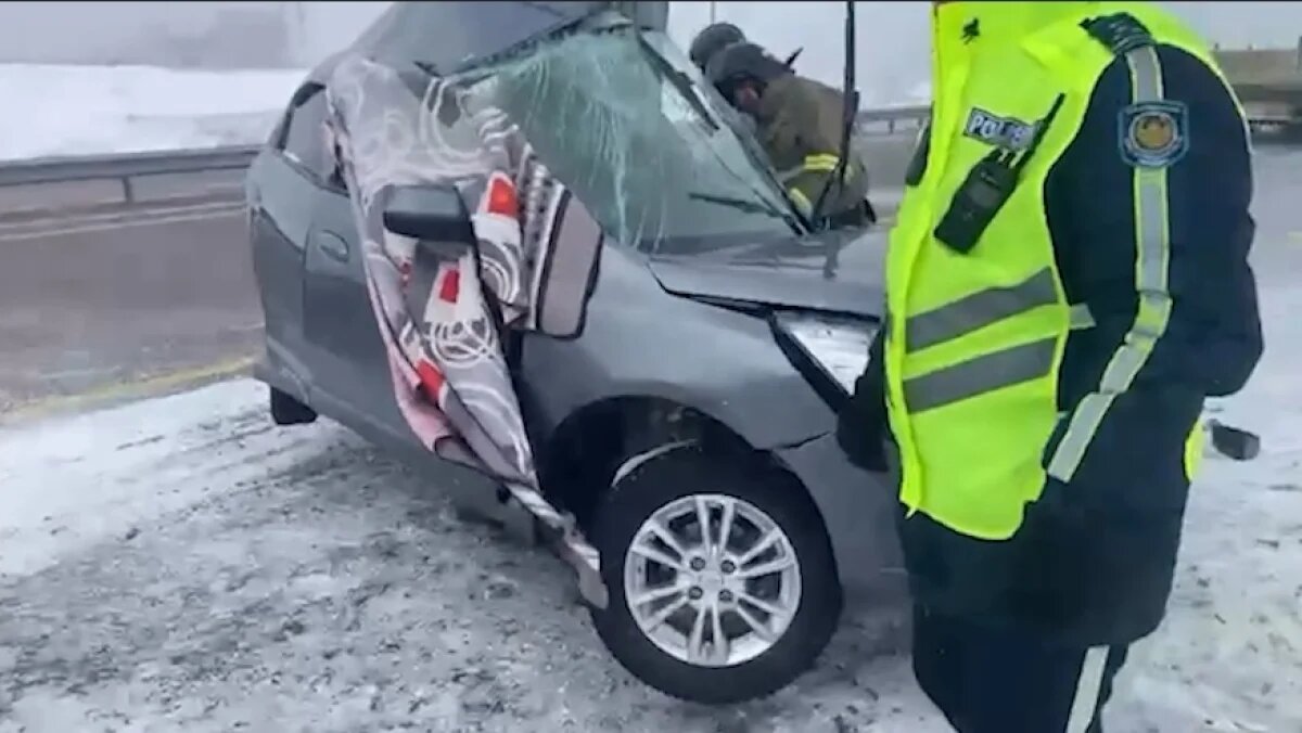 Легковушка боком врезалась в столб на объездной дороге в Караганде (ВИДЕО)