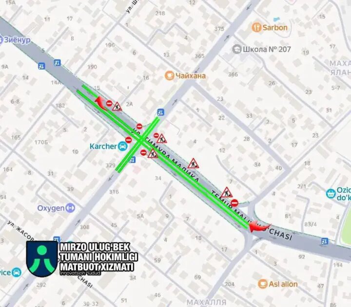 Согласно опубликованной информации, на указанном отрезке временно организован особый порядок движения. Водителям, следующим по улице Темура Малика со стороны улицы Султония, разрешен выезд на улицу Мирзо Улугбека с использованием встречной полосы. При этом установлен скоростной режим до 30 километров в час. Одновременно со стороны улицы Мирзо Улугбека обеспечен проезд по улице Темура Малика в направлении улицы Султония, также с ограничением скорости до 30 километров в час.