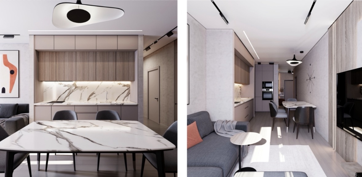 Семье из трех человек не требуется большая кухня и гостиная, поэтому было принято объединить зоны.