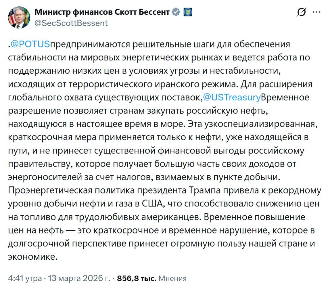 Министр финансов Скотт Бессент заявил, что США отменили санкции на покупку российской нефти отгруженную на танкера