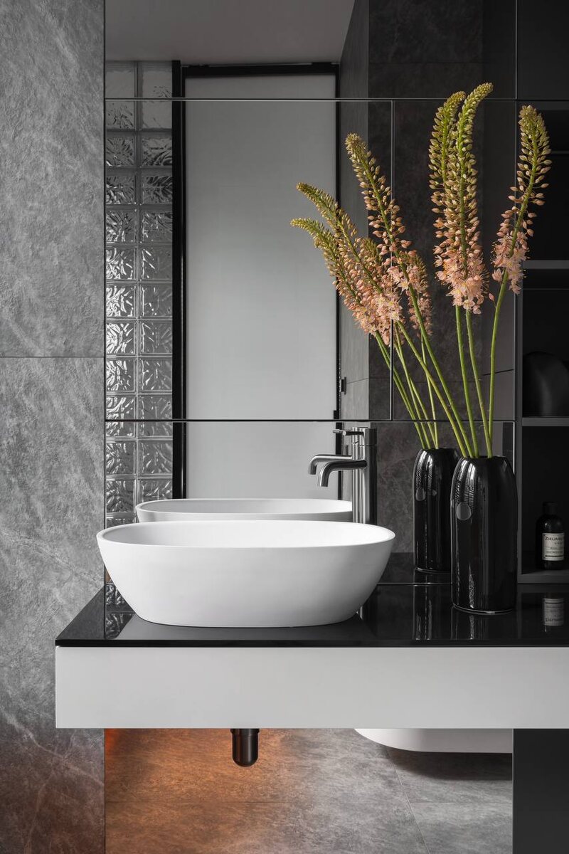 В этом проекте вся мебель собирается в одну систему: шкаф над инсталляцией, тумба под раковиной и высокий стеллаж. Внутри спрятано всё техническое: бойлер, гребенка и доступ к коммуникациям. Фасады выполнены из МДФ в эмали, корпус Egger. Фурнитура Blum с системой Tip-On и Blumotion, поэтому фасады открываются без ручек. Отдельный слой композиции – зеркальные панели Optiwhite. Они формируют цельную плоскость стены и одновременно скрывают часть конструкции. А в стеллаже появляется мягкая встроенная подсветка, которая делает ниши глубже и визуально легче.