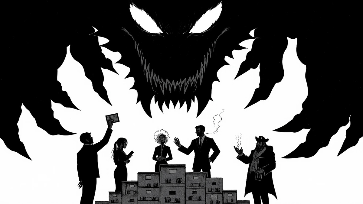Зал впечатлял. Посередине возвышался алтарь, сложенный из старых сейфов и канцелярских шкафов — явный символизм, понятный каждому бывшему бюрократу. Вокруг алтаря суетились люди (и нелюди) в балахонах с символами хаоса. В воздухе пахло серой, озоном и жжёной бумагой. А над алтарём висело нечто, от чего у Кая даже очки запотели, а у Зиты анализатор радостно заверещал, зашкаливая.
