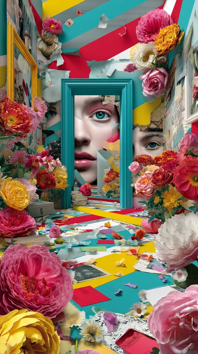 A small interior room in forced perspective: floor + two walls meeting in a corner, fully packed with elements, no empty space. Clean bright colors: vivid scarlet red, cyan, lemon yellow, pure white, deep black accents. On the walls: large poster-like human faces (front-facing, stylized photoreal collage), with oversized eyes. Many flowers (roses, peonies, daisies) bursting from frames and vases, layered like stickers. Bold diagonal stripes/light-beams run from top-left to bottom-right across the whole scene. Torn paper rips (tear portals) in the walls reveal more color layers beneath. Add ripped fabric edges, tape strips, confetti shapes, small geometric icons; everything crisp, high contrast, razor sharp. Studio-like even lighting, no blur, no text, no watermark, no logos. NEGATIVE: readable text, watermark, brand names, low detail, empty background, realism-only minimalism. —ar9:16 😊😊😊😊😊 Делала в нейросетях➡️ тут Обучение работе с нейросетями пиши ➡️ тут