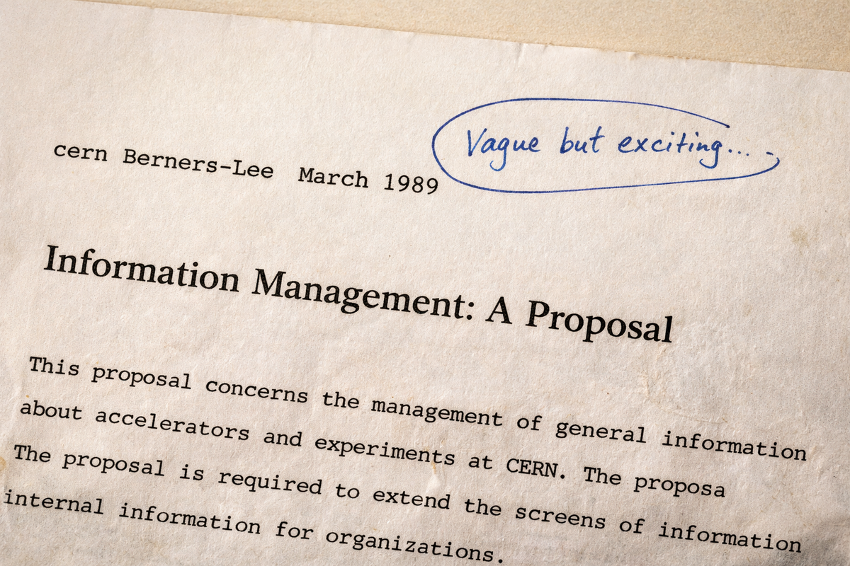 На титульной странице документа, поданного 13 марта 1989 года в канцелярию Европейского центра ядерных исследований, стоит рукописная резолюция начальника отдела Майка Сендолла. Всего три слова по-английски: «Vague but exciting» — «Расплывчато, но интересно».