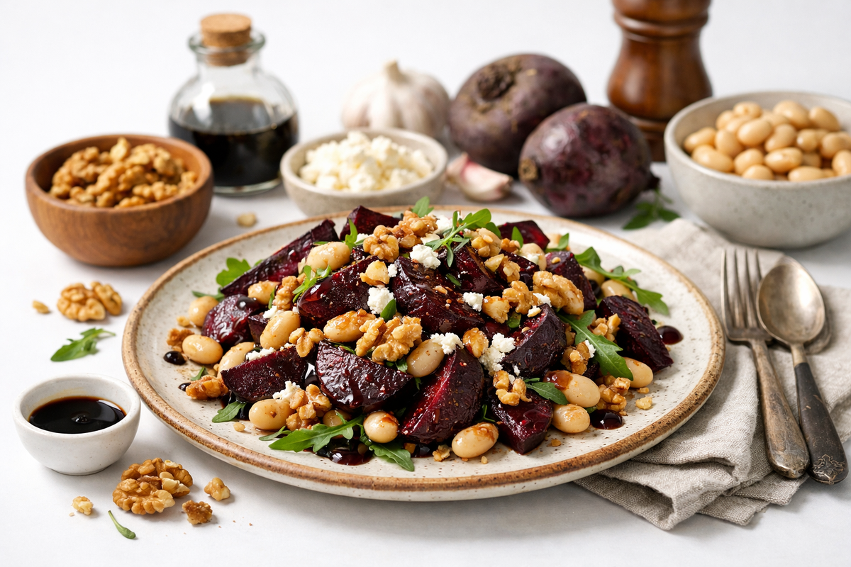 - Собери салат: тёплая свёкла + фасоль + лук, полей заправкой, сверху добавь зелень и орех. Подавай сразу, пока свёкла держит тепло.