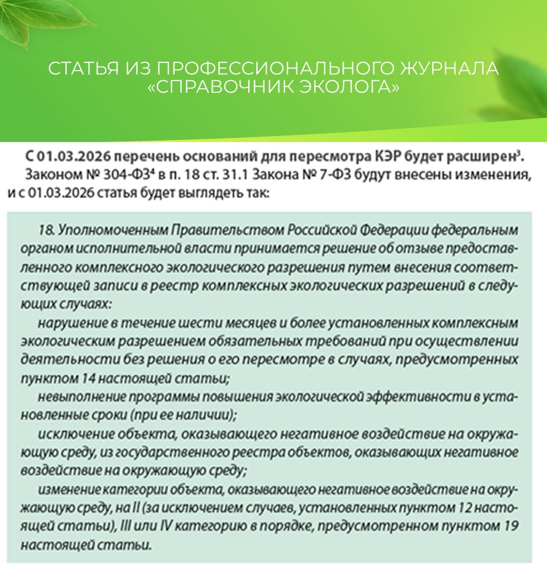 В.А. Субботинская в статье мартовского номера «Справочника эколога» пишет о понижении категории объекта, оказывающего НВОС, с I на II и возникающей в связи с этим правовой коллизии, которая впрочем с 1 марта должна быть устранена. Подписаться на журнал