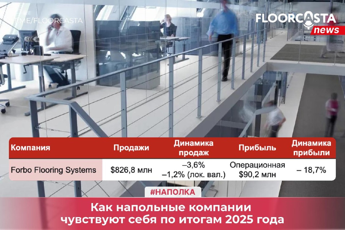 Часть 1: Forbo Flooring Systems – европейская устойчивость под давлением Начинаем разбирать отчётность глобальных игроков по итогам прошлого года. 🇨🇭 Швейцарская группа Forbo опубликовала годовой отчёт, и цифры её дивизиона напольных покрытий (Flooring Systems) дают хороший срез состояния премиального коммерческого сегмента в Европе. 🇨🇭 Forbo Flooring Systems: ключевые цифры 2025 года ➡️ Продажи: 738,2 млн швейцарских франков (CHF) – это примерно $827 млн по средневзвешенному курсу 2025 года. ➡️ Динамика продаж: Снижение на –3,6% в швейцарских франках, но всего –1,2% в локальных валютах. Реальное падение спроса, очищенное от валютных колебаний, оказалось минимальным. ➡️ Операционная прибыль (EBIT) сегмента: 80,5 млн CHF (–18,7% к 2024 году). Компания прямо указывает причины: слабая загрузка мощностей, рост затрат и укрепление швейцарского франка. Удержать объёмы удалось ценой сжатия маржинальности. География продаж 2025 (Flooring Systems): Европа — 76%, Северная и Южная Ам