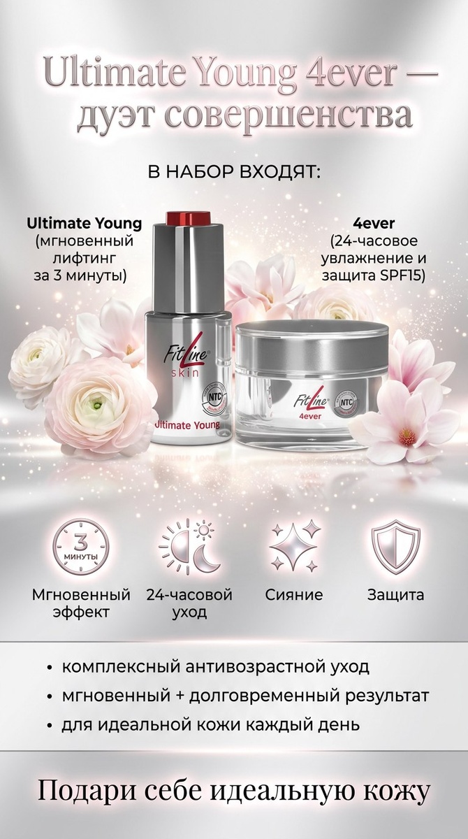 Набор Ultimate Young 4ever объединяет два мощных продукта для комплексного антивозрастного ухода. Это идеальное сочетание мгновенного результата и ежедневной заботы, которое подарит вашей коже сияние, упругость и защиту 24 часа в сутки. Наш 3-минутный лифтинг — эликсир в 2 этапа в одном флаконе для мгновенного эффекта! С корректировкой тона кожи: специальная формула обеспечивает идеальное совпадение продукта с вашим индивидуальным оттенком и помогает создать ровный и гладкий цвет лица. Ключ к е 📖 Читать статью 🛒 Смотреть продукт