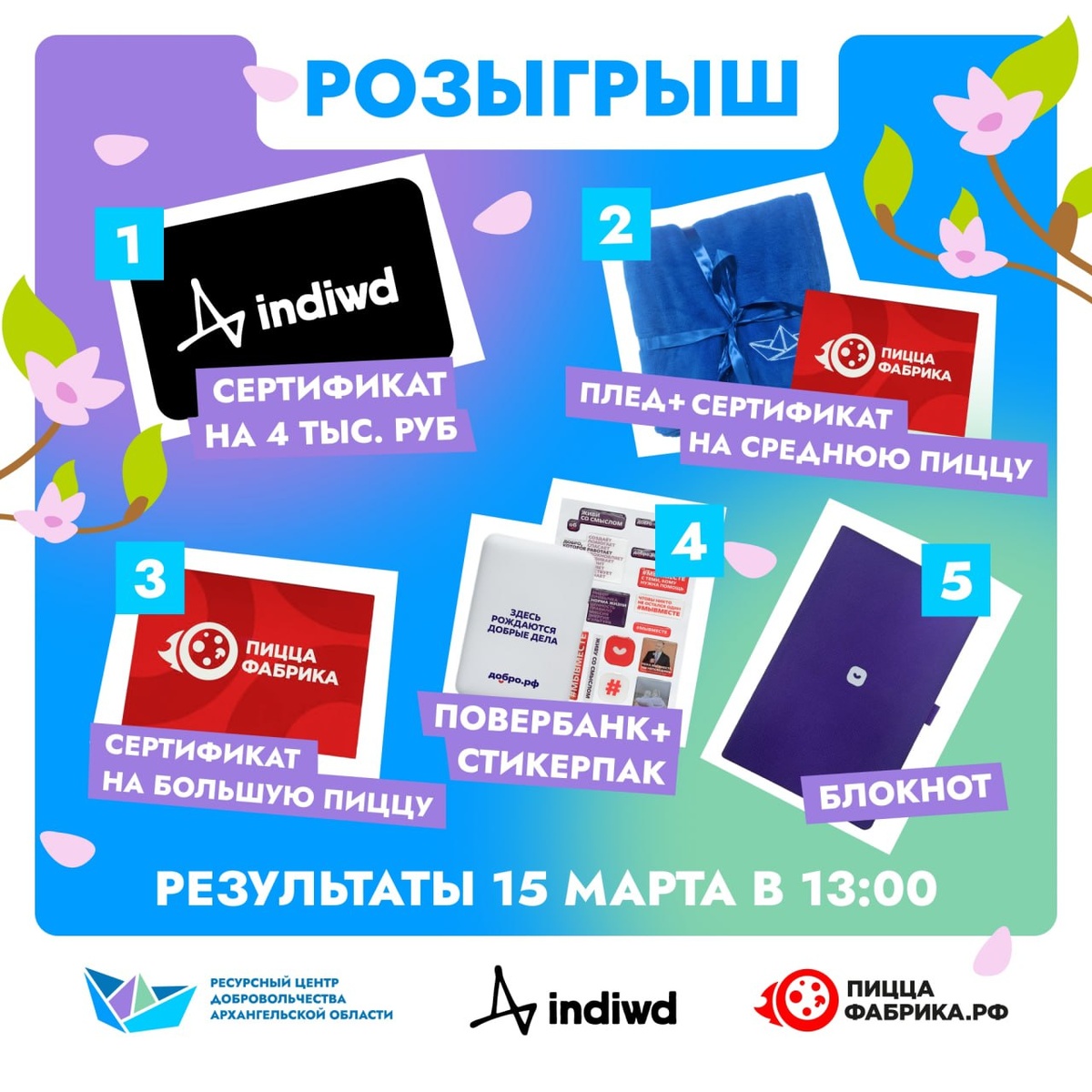 В честь наступления весны ребята решили разыграть ну очень крутые призы среди своих подписчиков! 👀 Что разыгрывают? Сертификат на 4 тысячи рублей от Индивида, плед + сертификат на среднюю пиццу, сертификат на большую пиццу, повербанк + стикерпак, блокнот. Условия очень простые, ознакомься с ними здесь 👈 Итоги подводят уже 15 марта! Успей поучаствовать и забрать приз себе 💜 Встречаем весну вместе с нацпроектом «Молодёжь и дети». #молод29 #нацпроекты #молодёжьидети #РЦДАО #ДоброРФ #волонтеры29