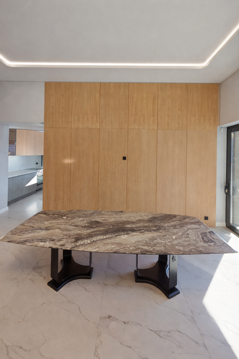 Натуральный шпон — это тонкий срез настоящего дерева, который наносится на основу из МДФ или фанеры. В результате получается поверхность с реальной текстурой древесины, но при этом конструкция остаётся стабильной и долговечной.