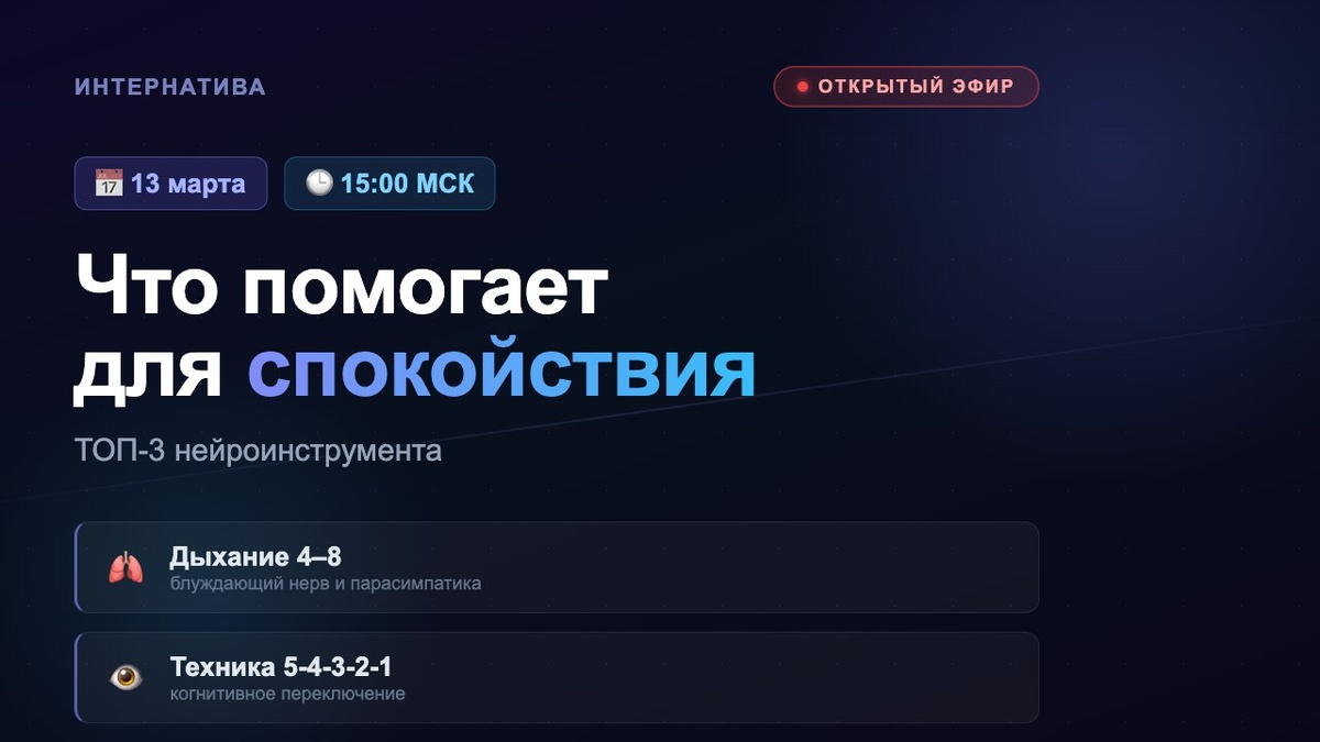 Ссылка на эфир https://youtube.com/live/_wFsASTGw2c?feature=share Что помогает для спокойствия: ТОП-3 инструмента Разберём, что происходит в мозге при стрессе и как вернуть спокойствие через три доказанных техники: 🫁 Дыхание 4–8 — блуждающий нерв 👁 Техника 5-4-3-2-1 — когнитивное переключение 💪 Мышечный релиз — телесный сигнал безопасности Спикер: Фирсова Анастасия, лектор кафедры нейропсихологии и нейрокоучинга МАФО Бонусы и практики: @internativa_bot