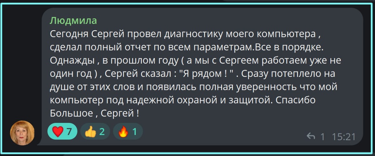 Недавно провёл диагностику компьютера Людмилы. Мы работаем уже несколько лет, и её компьютер используется каждый день. Когда люди обращаются за диагностикой, они обычно ожидают услышать список проблем. Но иногда происходит другое. Диагностика показывает, что система работает правильно. Я проверил состояние Windows, загрузку системы, состояние диска, работу программ и параметры безопасности. После проверки был подготовлен отчёт — в нём видно общее состояние компьютера и рекомендации по дальнейшему уходу. В этот раз серьёзных проблем не обнаружилось. И это тоже важный результат. Потому что диагностика нужна не только для поиска ошибок. Она даёт ясность состояния компьютера. Когда понимаешь, как работает система и в каком она состоянии, гораздо легче поддерживать её стабильную работу. 💬 После проверки Людмила написала: «Сразу потеплело на душе… появилась уверенность, что компьютер под надёжной защитой». Наверное, это и есть главный результат диагностики. Появляется спокойствие