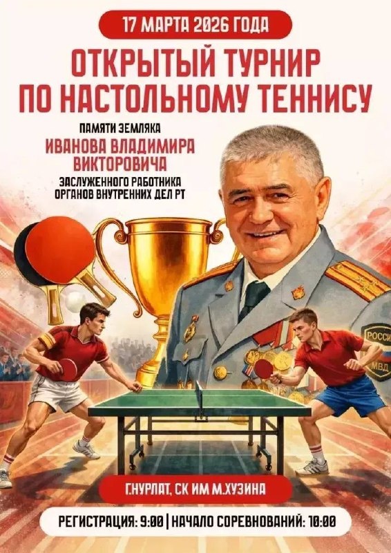 Ăмăрту ирхине 10 сехетре, регистраци 9 сехетре пуçланать. ТР ШӖМӗн уголовнăй шырав управленине нумай çул ертсе пынă хисеплӗ ентеше, ТР шалти ӗçсен тава тивӗçлӗ ӗçченне, ТР Обществăлла палатăн пайташӗ тата ТР ЧНКА председателӗн çумӗ пулнă Владимир Викторович Иванова асăнса мартăн 17-мӗшӗнче Нурлат хулинчи М.Хузин ячӗллӗ спорт комплексӗнче сӗтелçи теннисӗн уçă турнирӗ иртет. Кăмăл пуррисем пурте хутшăнма пултараççӗ.