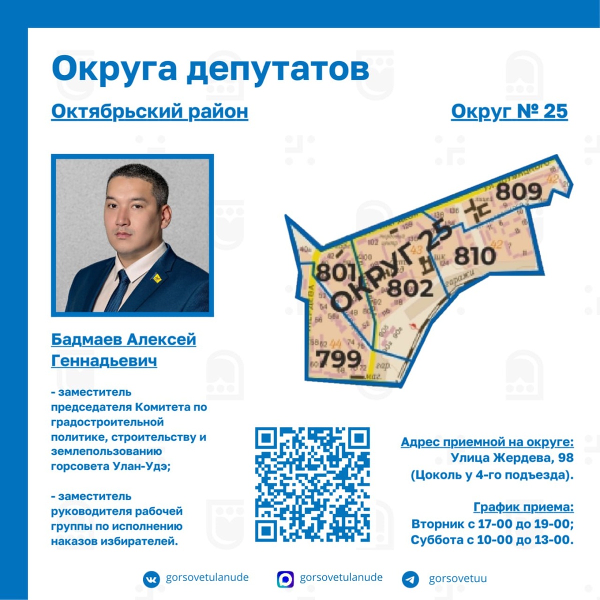 🔷Избирательный округ №25 🔹Округ № 25 хоть и небольшой по территории, но включает в себя бо́льшую часть 40-х кварталов Октябрьского района Улан-Удэ. Территория округа плотно застроена многоэтажными жилыми домами, что также накладывает свои особенности в работе с благоустройством общественных территорий. 🔹Депутатом округа является Алексей Геннадьевич Бадмаев, заместитель председателя Комитета по градостроительной политике, строительству и землепользованию Улан-Удэнского городского Совета депутатов и заместитель руководителя рабочей группы по исполнению наказов избирателей. 📍Адрес приемной на округе: Улица Жердева, 98 (Цоколь у 4-го подъезда). 🗓График приема: Вторник с 17-00 до 19-00; Суббота с 10-00 до 13-00. 🔎 Подробнее о том, какие улицы и дома входят в границы округа №25 - в нашем канале в MAX 👇 https://max.ru/gorsovetulanude/AZzlx8suJyQ ➡️ Горсовет Улан-Удэ в MAX | Telegram | ВК | ОК