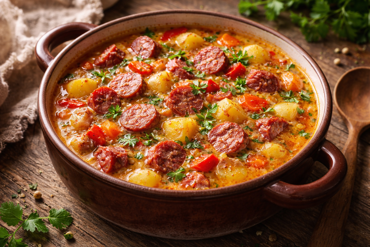 Густой суп с картофелем и колбасками.