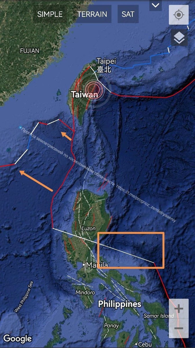 Признаки тектонического напряжения уровня М6+ наблюдаются между Лусоном и Тайванем