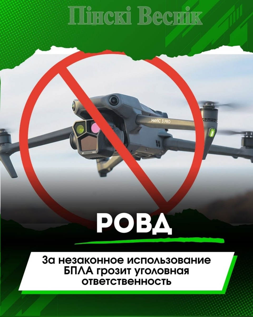 ✏️С 1 ноября 2025 года в Беларуси вступили в силу серьёзные изменения в законодательстве об использовании воздушного пространства. Что важно знать: Появилась новая статья в Уголовном кодексе (ст. 300¹) — «Незаконные действия в отношении гражданских беспилотных летательных аппаратов и авиамоделей». ☑️ Установлена административная ответственность за незаконный ввоз, хранение, оборот, эксплуатацию или изготовление дронов. ☑️Уголовная ответственность наступает, если нарушение совершено в течение года после административного взыскания за аналогичное нарушение. Возможные наказания: 🟦Штраф 🟦Общественные или исправительные работы 🟦Арест 🟦 Ограничение или лишение свободы на срок до 2 лет Будьте законопослушны: регистрируйте БПЛА, получайте необходимые разрешения и соблюдайте правила полётов. @Пинский Вестник 📱Ютуб 📱ВК 📱ИНСТАГРАМ 📱ОК 📱ФЕЙСБУК 📱ТИК ТОК Прислать новость