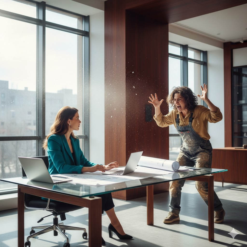 Но Карина не сдавалась. Она решила пойти ва-банк и пришла ко мне в офис. Вид у неё был боевой: волосы в побелке, под ногтями штукатурка, в глазах — огонь инквизиции.