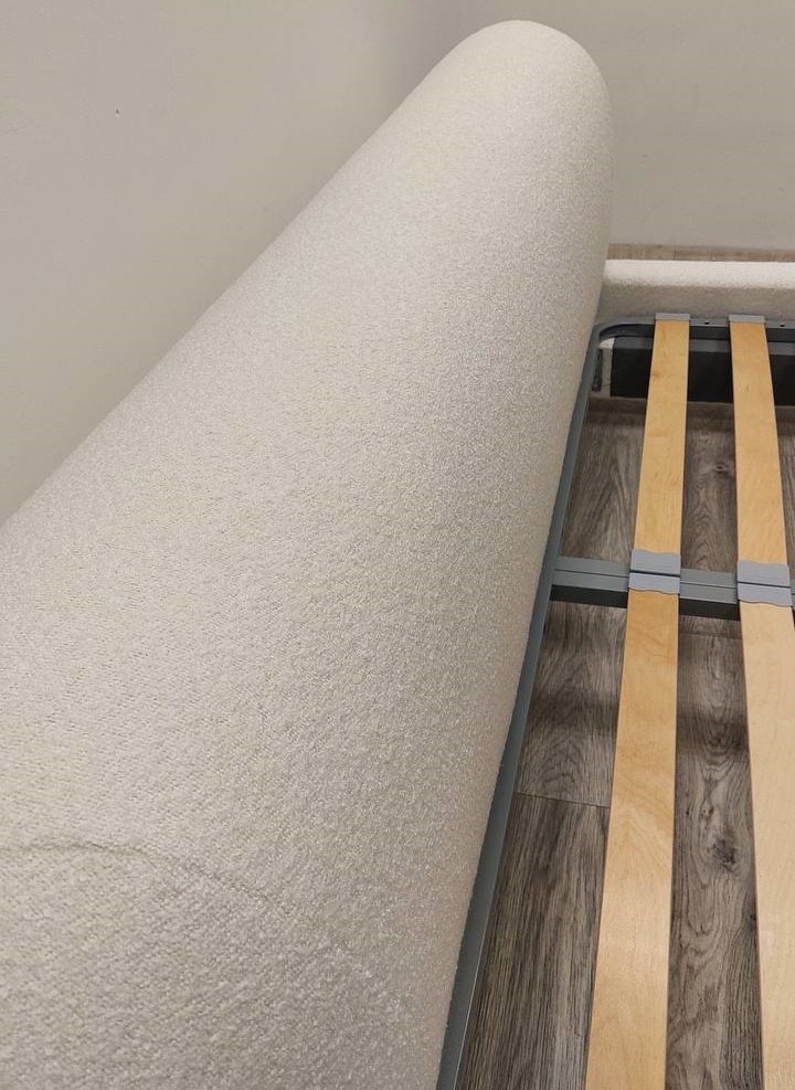 Роскошная кровать в современном стиле , ткань белое букле, ножки массив дуба