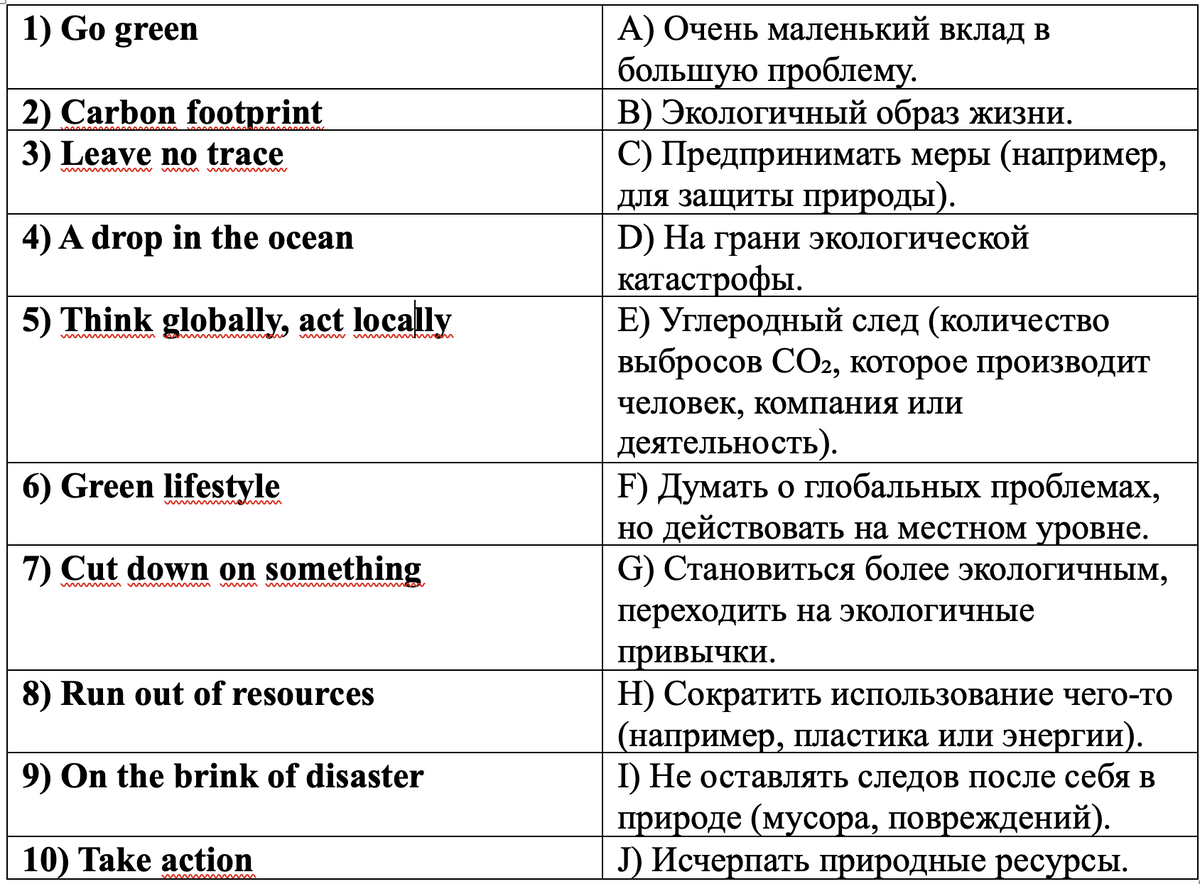 1) Go green = становиться более экологичным, переходить на экологичные привычки. Many companies are trying to go green by reducing plastic use. 2) Carbon footprint= углеродный след (количество выбросов CO₂, которое производит человек, компания или деятельность). Riding a bike helps reduce your carbon footprint. 3) Leave no trace= не оставлять следов после себя в природе (мусора, повреждений). When hiking, always leave no trace. 4) A drop in the ocean= очень маленький вклад в большую проблему. One person recycling may seem like a drop in the ocean, but it still matters. 5) Think globally, act locally = думать о глобальных проблемах, но действовать на местном уровне. Recycling in your city is a way to think globally, act locally. 6) Green lifestyle= экологичный образ жизни. More people are choosing a green lifestyle today. 7) Cut down on something= сократить использование чего-то (например, пластика или энергии). We need to cut down on plastic bags. 8) Run out of resources = исчерпать пр