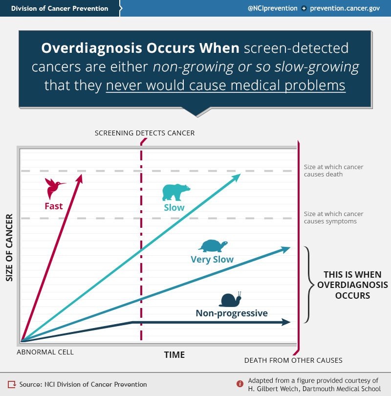 Раковая "хиромантия" по-американски. Чтобы оценить современные масштабы и перспективы потенциальной угрозы рака, рассмотрим ситуацию на примере Соединенных Штатов Америки - одного из флагманов авангардной коммерциализированной медицины западного типа. Схема, представленная NCI Division of Cancer Prevention в оправдание учащения случаев т.н. овердиагноза, невольно вызывает ассоциации с хиромантическими "линиями жизни" на ладони. Только на этих четырех линиях отображена судьба всего американского народа... Улитки и Черепахи. На этих линиях жизни сейчас равномерно расположились судьбы примерно 165 миллионов американцев. Это люди (особенно на линии Улиток) с достаточно сильным иммунитетом. В соответствии с этиологией рака колонии раковых клеток в их организмах не получают особых привилегий, чтобы приобрести статус опухолей при жизни хозяев. Пограничные слои с линии Улиток могут вовлекаться на линию Черепах. Медведи и Птицы. На этих линиях жизни сосредоточены судьбы