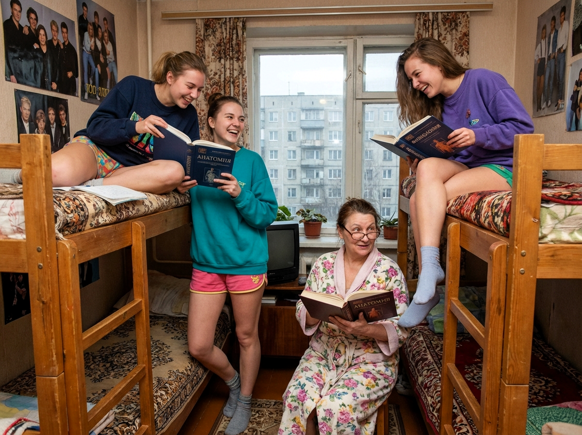 Первая неделя в общаге — это хаос. Мы адаптировались к новым условиям жизни, уехав из уютных родительских гнёздышек, впервые узнавали, что такое «дежурство по комнате», учились готовить еду, распределять бюджет, взаимодействовать друг с другом. А ещё лекции — анатомия, латынь, основы медицинских манипуляций и так далее — голова шла кругом.
