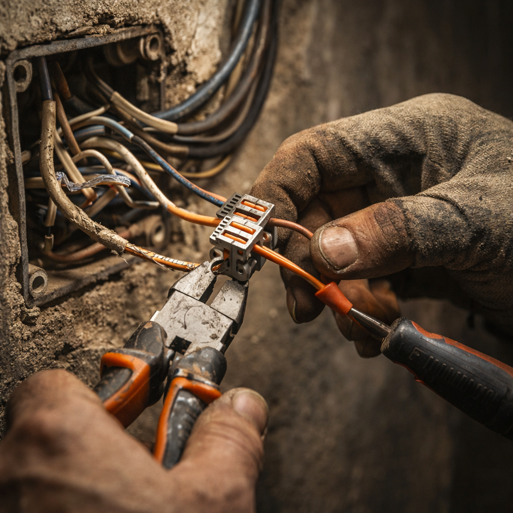 Перед началом работы обязательно отключается питание в щитке и проверяется отсутствие напряжения индикатором. После этого нужно определить место подключения нового провода. Обычно это старая распределительная коробка или существующая розетка. Именно там проще всего выполнить аккуратное и безопасное соединение.