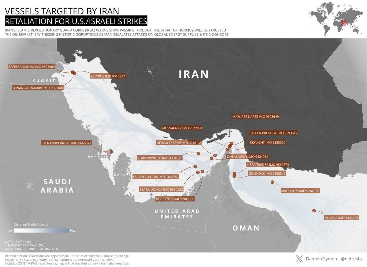 ❗️⚡️По меньшей мере 18 коммерческих судов стали целью атаки в Персидском заливе и Ормузском проливе с начала войны против Ирана.