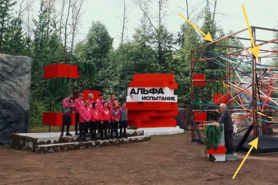 И сразу состязание на 100 тысяч. Нужно залезть на ленточки и замереть. Ведущий Демчог будет разрезать по одной ленте определённого цвета. Первыми ушли белые ленты.