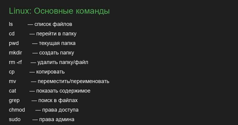 📁 Файловая система: ls — список файлов ls -la — подробно cd /path — перейти pwd — текущая папка 📝 Файлы: mkdir folder — создать папку rm file — удалить файл rm -rf folder — удалить папку cp from to — копировать mv from to — переместить cat file — показать содержимое 🔍 Поиск: grep "text" file — искать в файле find . -name "*.py" — найти файлы ⚙️ Права: chmod +x script — сделать исполняемым chmod 755 file — права доступа 🔐 sudo — права администратора