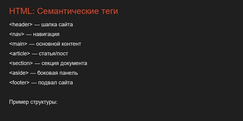 Семантика = тег говорит сам за себя <header> <nav>...</nav> </header> <main> <article> <section>...</section> </article> <aside>...</aside> </main> <footer>...</footer> 📌 Основные теги: 🏠 <header> — шапка сайта Логотип, название, навигация 🧭 <nav> — навигация Меню ссылок 📰 <main> — основной контент Главная информация 📝 <article> — независимый контент Статья, пост, комментарий 📑 <section> — тематическая секция Глава, блок 📢 <aside> — боковая панель Реклама, похожие статьи 🦶 <footer> — подвал Контакты, копирайт 💡 SEO любит семантику!