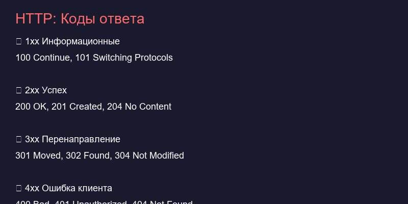 📗 1xx — Информационные • 100 Continue • 101 Switching Protocols 📘 2xx — Успех • 200 OK — всё ок • 201 Created — ресурс создан • 204 No Content — без содержимого 📙 3xx — Перенаправление • 301 Moved Permanently — перемещено • 302 Found — временно • 304 Not Modified — не изменилось 📕 4xx — Ошибка клиента • 400 Bad Request — неверный запрос • 401 Unauthorized — не авторизован • 403 Forbidden — запрещено • 404 Not Found — не найдено 📓 5xx — Ошибка сервера • 500 Internal Server Error • 502 Bad Gateway • 503 Service Unavailable 💡 Запомни: 2xx — ок, 4xx — ты виноват, 5xx — сервер виноват