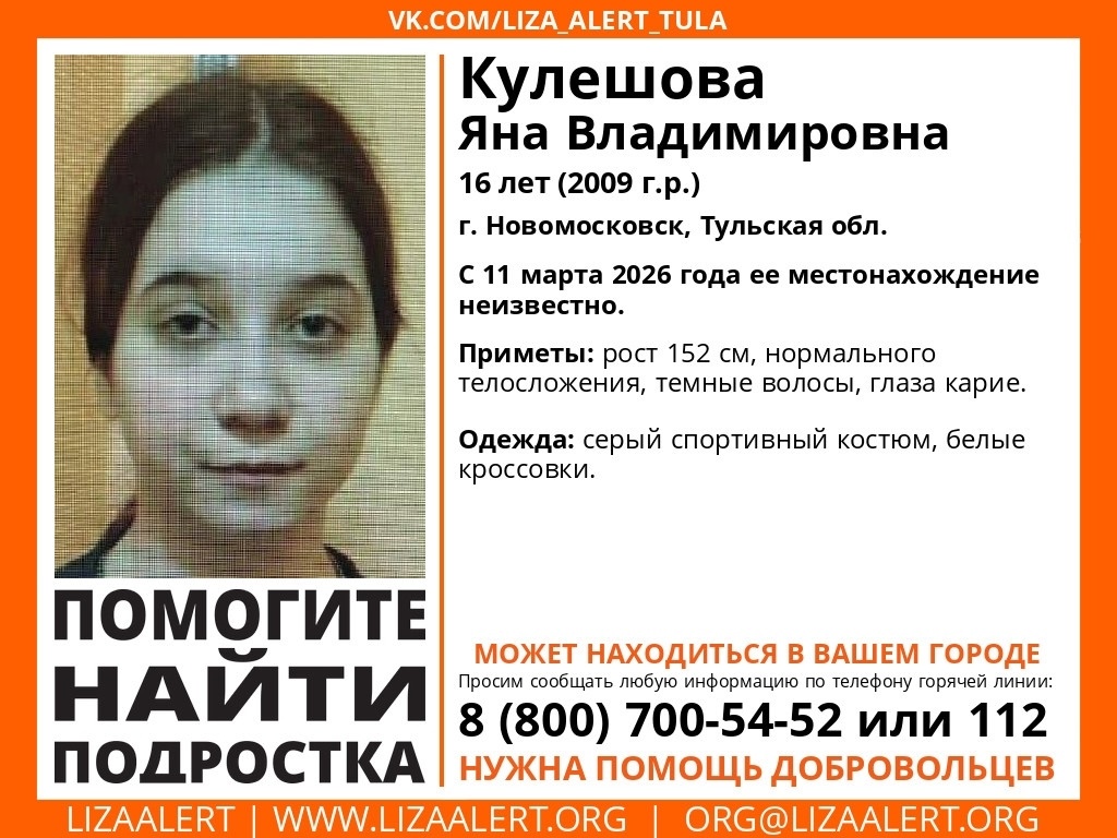В Тульской области второй день ищут 16-летнюю Яну Кулешову из Новомосковска. Об этом сообщает ДПСО «ЛизаАлерт». В последний раз девушку видели 11 марта. Ее рост – 152 сантиметра, телосложение нормальное, волосы длинные и темные, а глаза карие. В день исчезновения Яна была одета в серый спортивный костюм и белые кроссовки. Если вы видели Яну или знаете что-либо о ее местонахождении, звоните: