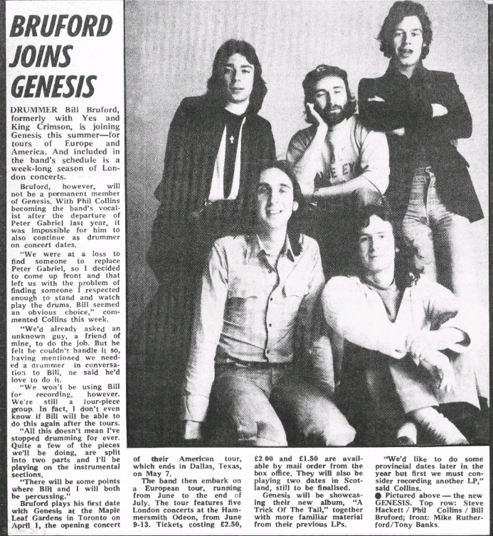 13 марта 1976 года вышел небольшой материал в Melody Maker, в котором официально сообщалось, что Билл Бруфорд присоединился к Genesis, правда, на временной основе. ---------------- Барабанщик Билл Бруфорд, ранее выступавший в группах Yes и King Crimson, этим летом присоединится к Genesis — для туров по Европе и Америке. В расписание группы также включён недельный цикл концертов в Лондоне. Однако Бруфорд не станет постоянным участником Genesis. После ухода Питера Гэбриэла в прошлом году Фил Коллинз стал вокалистом группы, и ему стало невозможно одновременно исполнять обязанности барабанщика на концертах. «Мы были в растерянности, пытаясь найти кого‑то на замену Питеру Гэбриэлу, поэтому я решил выйти на передний план — и это поставило нас перед задачей найти кого‑то, кого я достаточно уважал бы, чтобы спокойно стоять и смотреть, как он играет на барабанах. Билл показался очевидным выбором», — прокомментировал Коллинз на этой неделе. «Мы уже просили неизвестного музыканта, моего друга, вз