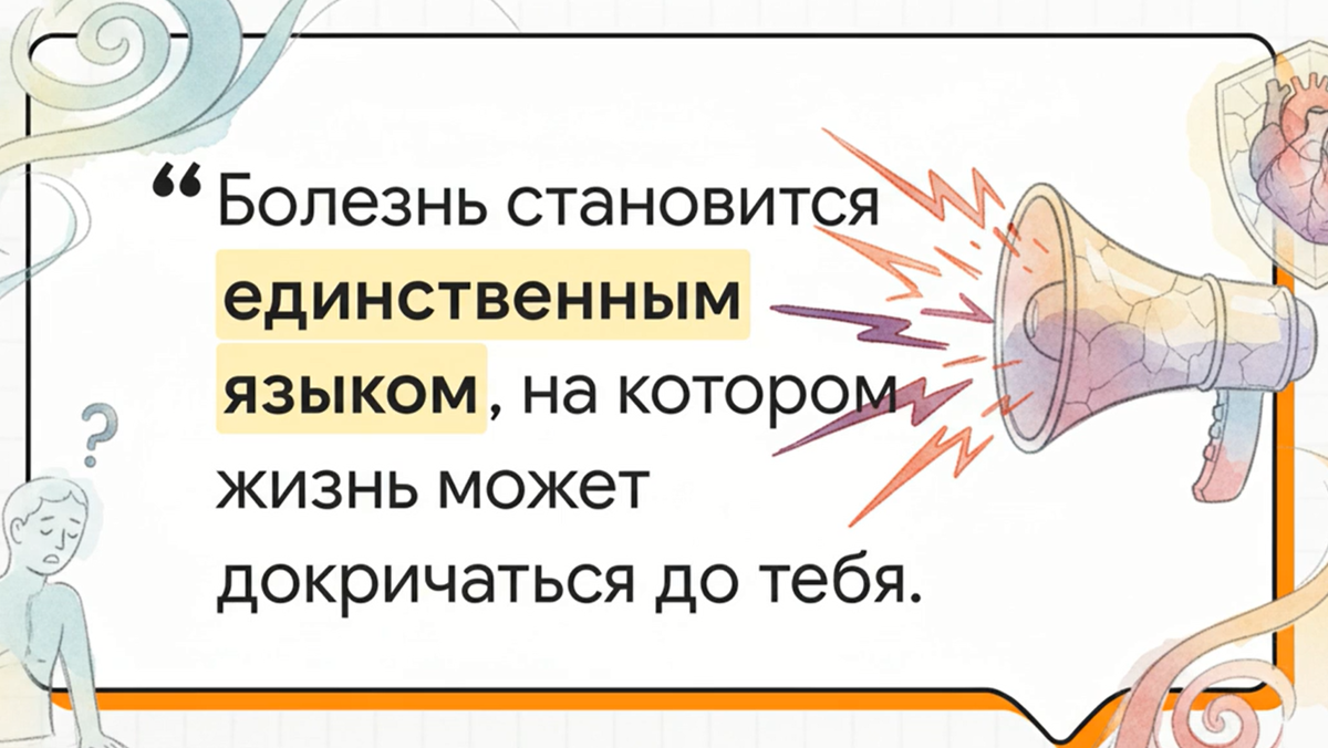 И в какой‑то момент болезнь становится как будто единственным языком, через который жизнь может до тебя докричаться. Ты не слышал через намёки, через лёгкий дискомфорт, через усталость — тогда тело говорит громче.