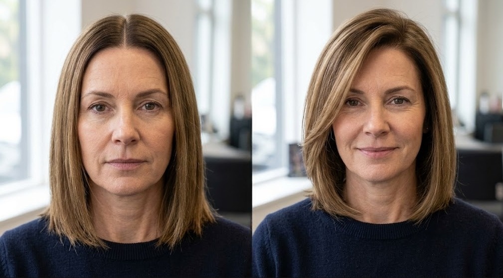 Представьте: вы заходите в салон, тратите приличную сумму, выходите с красивой укладкой - и всё равно выглядите старше, чем хотелось бы. Знакомо? А ведь проблема может быть вовсе не в цвете волос и не в длине. Есть одна крошечная деталь, о которой большинство мастеров предпочитает молчать. Не потому что они злодеи - просто это неловкий разговор. Но сегодня мы его всё-таки заведём. Итак, что это за деталь? Да, вот так просто. Один пробор способен визуально добавить вам пять, семь, а то и десять лет. И при этом ни одна баночка крема и ни одна процедура в салоне не даст такого эффекта омоложения, как его правильное расположение. Вы спросите: как такая мелочь вообще может что-то менять? Давайте разберёмся. Слева - прямой пробор, справа - боковой пробор. Один и тот же человек, разница заметна сразу. С возрастом у всех нас происходит несколько вещей одновременно: лицо немного «оседает» вниз, скулы становятся менее выраженными, виски западают, а лоб кажется более высоким. Всё это абсолютно