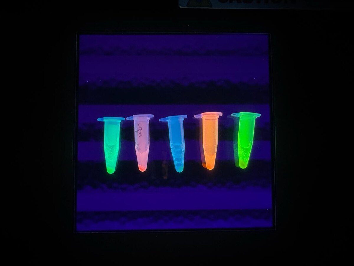 Точнее, почти что радуга из светящихся белков. Наш редактор сам вырастил их в одной из лабораторий МГУ. Когда-то давно эти белки нашли у морских кораллов, которые еле-еле светятся в ультрафиолете. Кораллам они помогают защищаться от лишнего кислорода, потому что в больших количествах он превращается в яд. Но ученые украли эти белки у кораллов… и подсадили бактериям! И теперь бактерии красиво светятся, и ими даже можно рисовать картины. Есть даже целые выставки, где, например, повторяют картины Ван Гога. Но зачем вообще это нужно? Во-первых, бактерии прозрачные, а так их можно увидеть. А во-вторых, так можно красить их внутренности! Можно увидеть, где внутри бактерий ДНК и есть ли там нужные нам гены. Можно покрасить токсины, а можно нужные нам лекарства. Так сразу видно, что в бактерии есть, а чего нет. А еще можно следить за жизнью бактерий. Снова напоминает тамагочи. Если светится ярко, значит, у бактерии все хорошо и она служит на благо науки. А если потухла, значит, нужна новая бак