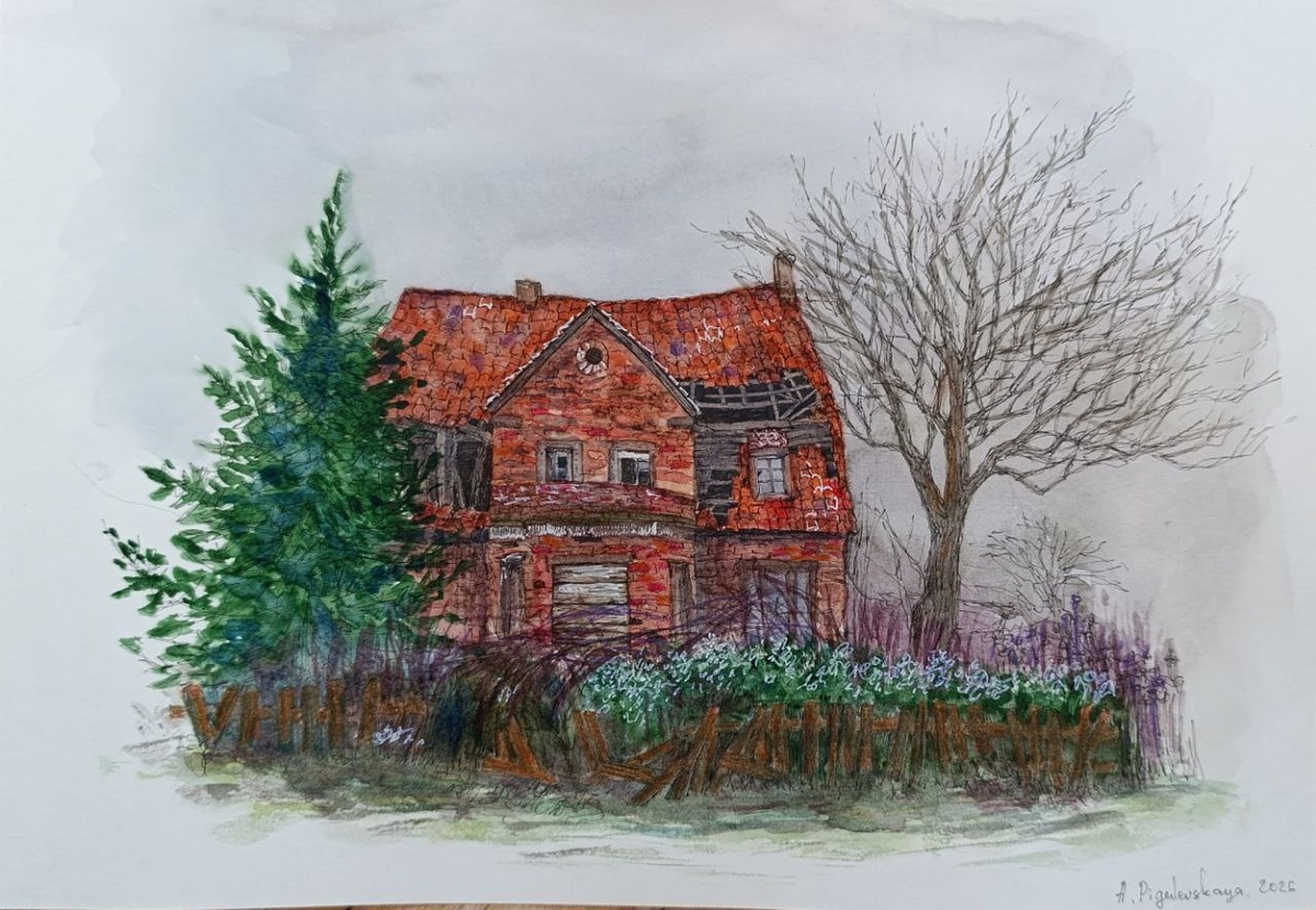 бумага, акварель, изограф, цв.карандаши . п.Октябрьское, Правдинский район, Калининградская область (до 1946 года: Кляйн Шёнау, Восточная Пруссия) . Впервые я увидела этот потрясающий дом в 2021 году, и влюбилась в него😍 В тот день была максимально калининградская погода (благородная серость), добавляющая дому особую мистическую привлекательность. Последний раз я его видела в 2025 году. За эти годы он сильно утратил свою силу, но всё так же привлекателен. Сколько лет он ещё простоит, сложно сказать... Но однозначно могу сказать, он - великолепен! . #art #sketch #watercolors #architecture #apigulevskaya_art