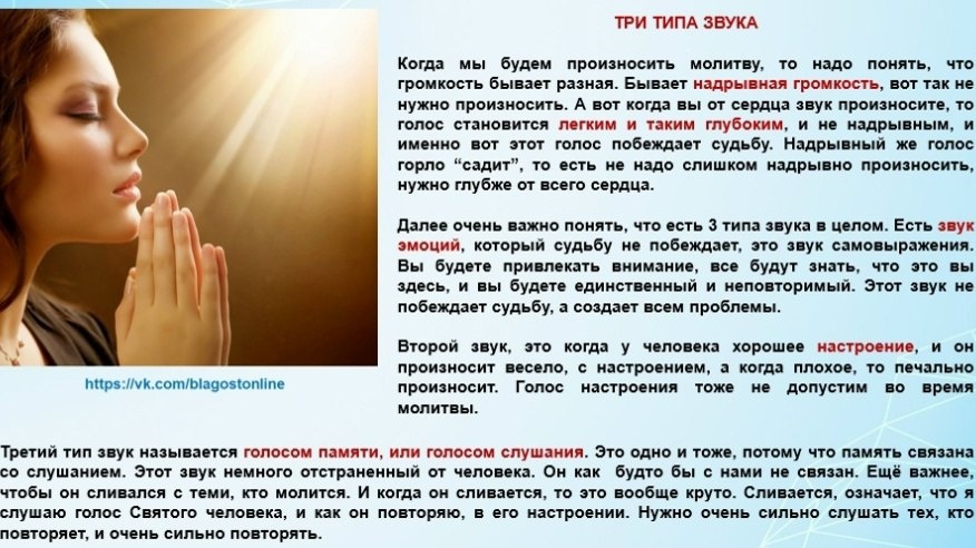 Когда мы будем произносить молитву, то надо понять, что громкость бывает разная. Бывает надрывная громкость, вот так не нужно произносить. А вот когда вы от сердца звук произносите, то голос становится легким и таким глубоким, и не надрывным, и именно вот этот голос побеждает судьбу. Надрывный же голос горло “садит”, то есть не надо слишком надрывно произносить, нужно глубже от всего сердца. Далее очень важно понять, что есть 3 типа звука в целом. 💛 Есть звук эмоций, который судьбу не побеждает, это звук самовыражения. Вы будете привлекать внимание, все будут знать, что это вы здесь, и вы будете единственный и неповторимый. Этот звук не побеждает судьбу, а создает всем проблемы. 💜 Второй звук, это когда у человека хорошее настроение, и он произносит весело, с настроением, а когда плохое, то печально произносит. Голос настроения тоже не допустим во время молитвы. 💚 Третий тип звук называется голосом памяти, или голосом слушания. с 💬 Мы в мессенджере МАХ