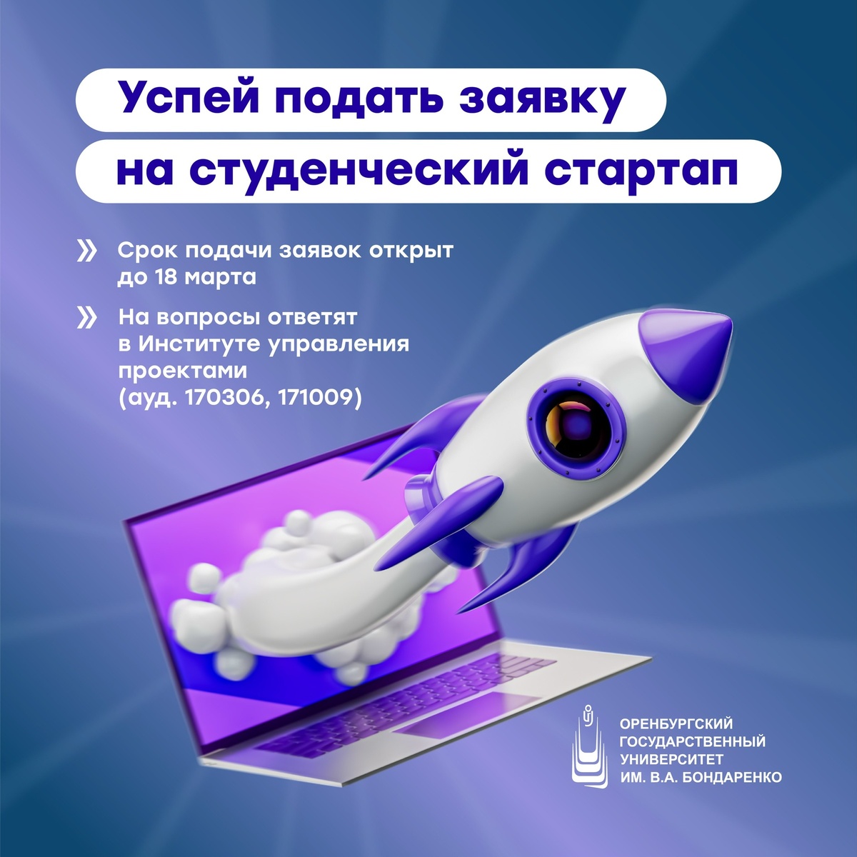 🚀 До 18 марта открыт приём заявок на грантовый конкурс «Студенческий стартап». Это шанс получить финансирование, поддержку экспертов и сделать первый шаг в бизнес. Участвовать могут студенты, ординаторы и аспиранты российских вузов. Заявки принимаются по направлениям: цифровые технологии, медицина и здоровьесбережение, новые материалы и химические технологии, новые приборы и интеллектуальное производство, биотехнологии, ресурсосберегающая энергетика и креативные индустрии. Подавай заявку на сайте ⬅️ За консультацией обращайся в Институт управления проектами ОГУ: 📎 www.osu.ru/doc/5084 📍Оренбург, пр. Победы, 13, ауд. 170306, 171009 Не упусти возможность воплотить идею в жизнь! 🔥 🇷🇺 Мы в MAX #ОГУ #в_ОГУ #OSU